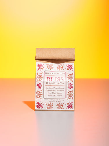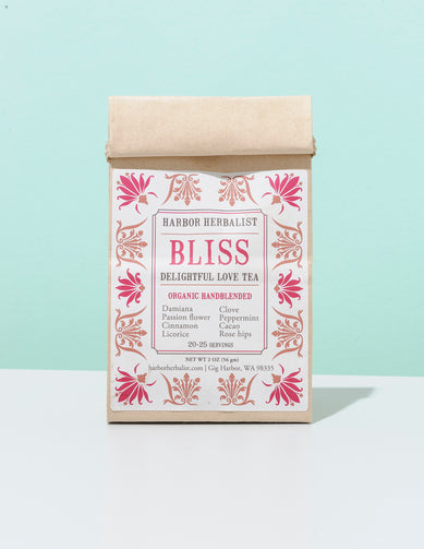 Bliss is defined as “perfect happiness” and “serene joy”. This loose leaf love tea will encourage a sense of wellbeing and bliss. A truly inspiring blend whose lavish flavor will help bring forth your confident sensual side. Aromatic cloves, cinnamon, and roasted cacao nibs appeal to your senses as you steep Bliss. Both damiana and passionflower are slightly bitter, so we carefully balanced them with soothing peppermint and rose hips. The licorice adds a kiss of sweetness.